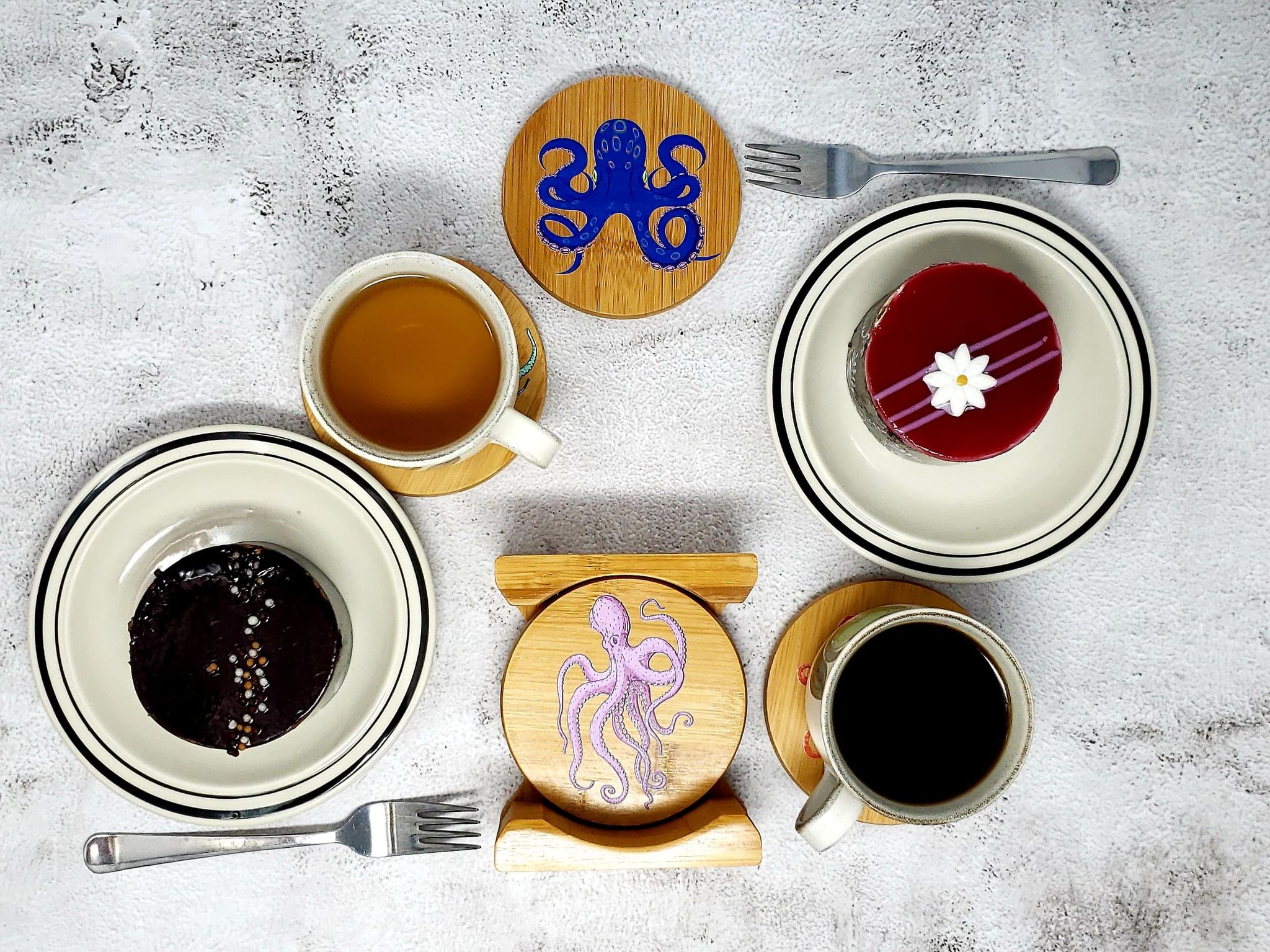 Bring some fun to your table with these bamboo coasters. This gorgeous set includes 4 coasters with beautiful prints of octopuses plus coaster holder.